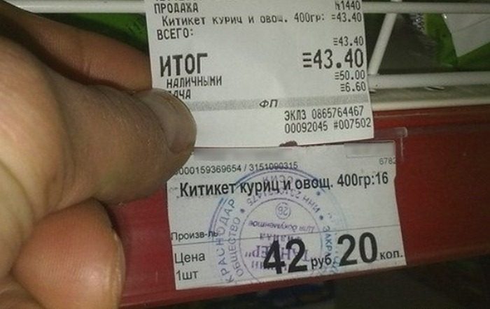 «Сходил забить холодильник в супермаркет. Набрал корзину и на кассе все пробил. Получилось 697,70 за 11 позиций всякого-разного. …решил проверить правильность цен. Пакет с едой в камеру хранения, а сам с чеком в руках в торговый зал. Итого: несовпадение цен по 7-ми пунктам. По 7-ми из 11-ти, Карл! Естественно не в мою пользу. Зову администратора. Ходим-считаем и оказалось, что продуктов я набрал на 520.80 рублей. Т.е. сперли у меня 176,90. Деньги вернули без лишних разговоров и оправданий. Видать этот процесс для них рутинный. Заняло все минут 15. Пообещал закупаться только у них», — поделился опытом клиент (орфография и пунктуация сохранены). Меньше полуфабрикатов