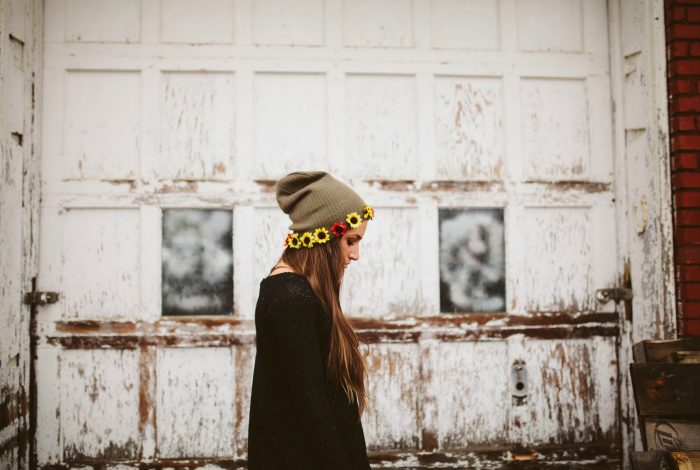 Украсить скучную зимнюю шапку можно с помощью ярких искусственных цветов, нашитых на край.