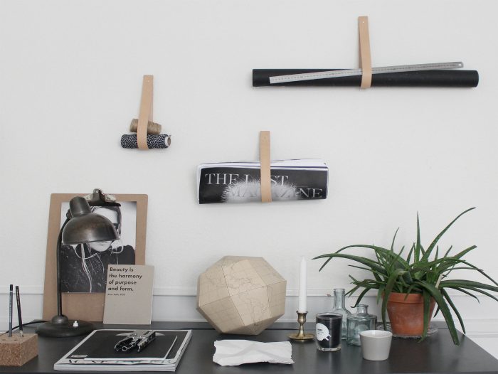 Стильные минималистические вешалки, сделанные из полосок кожи, прибитых к стене.