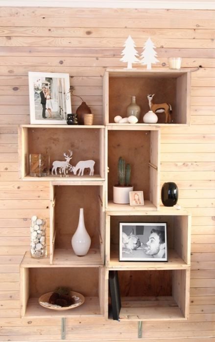 Природная структура деревянных ящиков идеально вписывается в разные стили: эко, лофт, шебби-шик, скандинавский, прованс. Функциональные стеллажи и полки будут смотреться в интерьере гармонично. Их можно заполнить посудой, книгами, журналами и сувенирами. Предварительно следует проверить, чтобы все ящики были целыми. Также желательно обработать их наждачной бумагой, чтобы их поверхность была гладкой. Для сохранения природной структуры нужно ящики обработать морилкой или грунтовкой с естественным оттенком. Верхнюю часть, при желании, покрыть лаком.