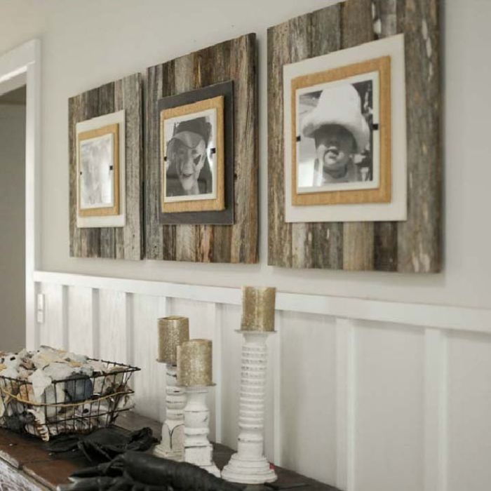 Интерьер становится особенно уютным, когда его украшают семейными фотографиями. Интересно, что рамки для них тоже можно сделать из ненужных старых досок. Стоит лишь закрепить несколько штук на стене. А фото прикрепить при помощи канцелярских булавок или клея. С небольших брусков получатся отличные настольные рамки, которые можно декорировать мешковиной и джутом.