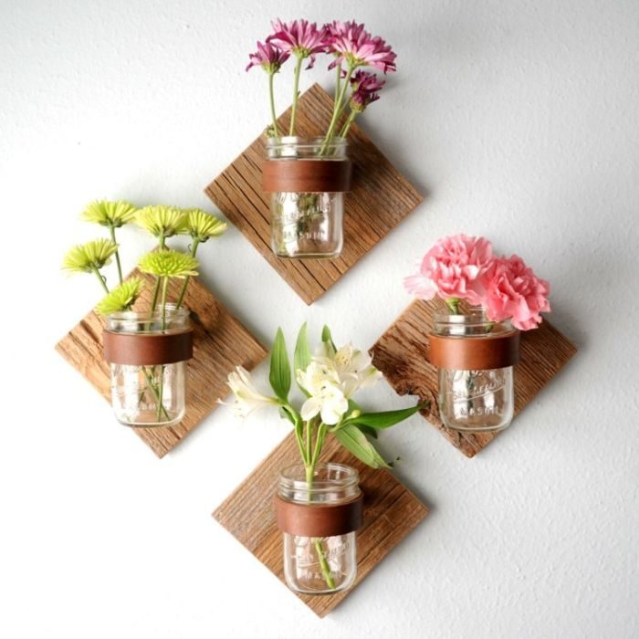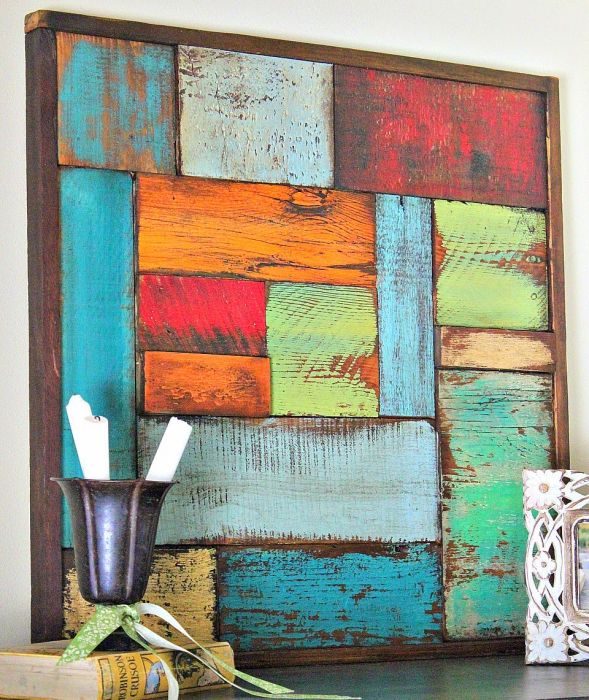 Древесина – универсальный материал, который особенно хорошо смотрится в интерьере, оформленном в экологическом стиле. Для создания бюджетного декора из дерева понадобятся доски и бруски разных размеров, лак, клей и акриловые краски. Интересно смотрятся в интерьере настенные композиции из цветов, закреплённых на деревянных досках. Такой вариант подойдёт даже для интерьеров в стиле прованс или шебби шик.