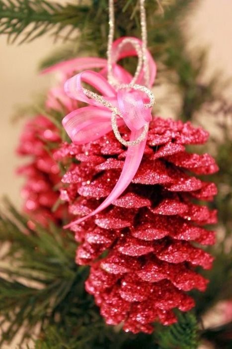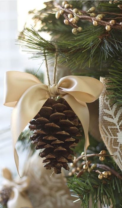 Стоит лишь украсить шишку атласным банком, как она станет прекрасной ёлочной игрушкой