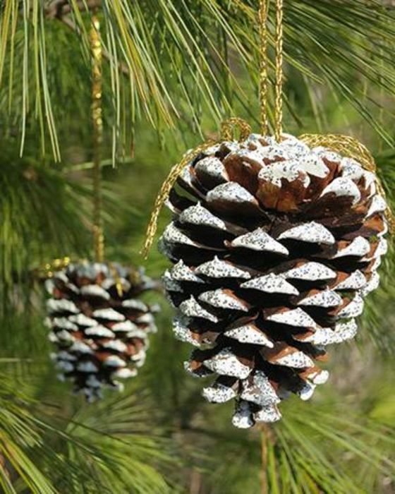 Сосновые и еловые шишки вызывают ассоциации с лесом и наполняют дом прекрасным ароматом. И даже, если интерьер будет украшать искусственная ёлка, создастся впечатление, что она настоящая. Для усиления эффекта еловые и сосновые шишки можно использовать в качестве декоративных элементов. Например, поставить в прозрачные банки свечи, перевязать сосуды джутом и завершить композицию несколькими шишками. Для придания им заснеженного вида, заранее необходимо покрасить их белой или серебристой краской.