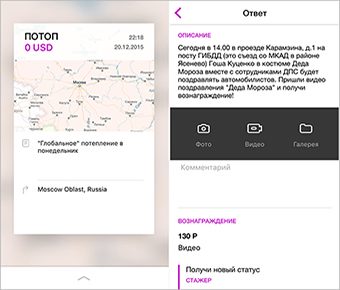 Цена устанавливается для каждого задания отдельно. Например, за 40-секундное видео незаконной продажи елок обещают заплатить 195 руб. За съемку того, как Гоша Куценко поздравляет автомобилистов — 130 руб. Помимо списка заданий в приложении есть форма для регистрации — если пользователь хочет, чтобы видео подписали его именем, а также чат с редакцией. В нем можно предложить свои идеи для съемок.