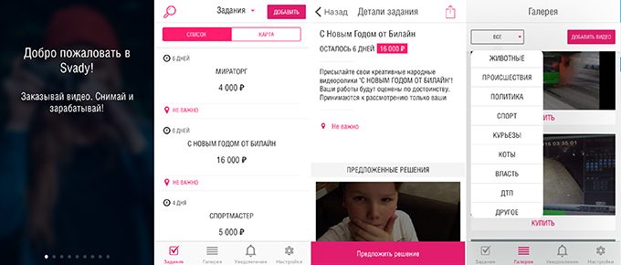 По аналогичному принципу работает другое российское приложение — Svady. Здесь также можно либо выполнить одно из предложенных заданий, либо загрузить любое видео, которое приложение поместит в один из тематических блоков: например, «власть», «коты» или «криминал». В отличие от приложения «360 Репортер» здесь нет гарантии, что вам заплатят. Все задания — конкурсные: несколько пользователей загружают свои варианты, а заказчик выбирает лучший и переводит деньги его автору. Зато и заработать тут можно больше. За лучший поздравительный ролик «Билайн» обещает 16 тыс. руб., «Мираторг» — 4 тыс. руб. Цена контента, который пользователи загружают по своей инициативе, зависит от его популярности. Подробностей ни в приложении, ни на сайте Svady нет. Пожалуй, возлагать чрезмерные надежды на эту часть сервиса не стоит: из видео, доступных в приложении сейчас, купили только один ролик. Но если заработать все же удастся, вывести деньги можно будет через PayPal.