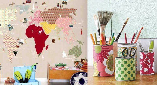 1. Если осталось несколько видов обоев, можно сделать из них карту мира на стене в детской комнате. Это и красиво, и забавно, и полезно для развития. К странам и континентам можно приклеить изображения животных, которые там водятся, или фотографии городов.