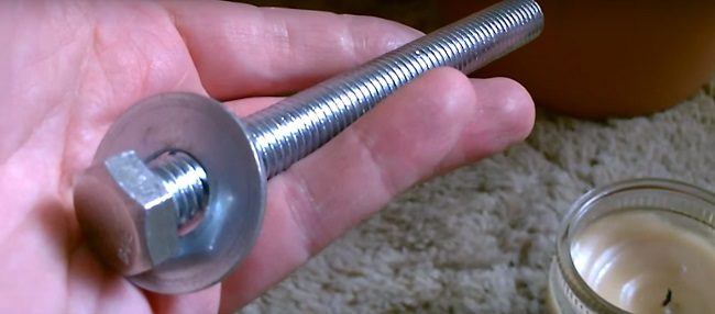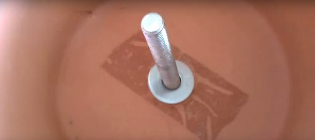 1. Сначала просверли отверстие в горшке. Вставь болт с шайбой в него.