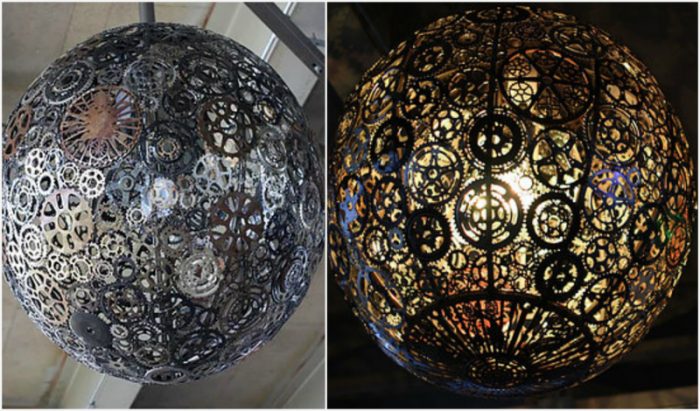 Металлический светильник-шар из ненужных велосипедных запчастей.