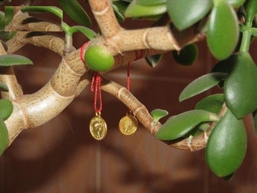 Суеверные люди, сажая толстянку, закапывают в землю монетку, чтобы привлечь к себе деньги. С этой же целью денежное дерево принято на НОВЫЙ ГОД украшать монетками разного достоинства.