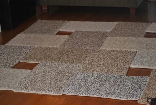 Пробелы в центре она заполнила цветными кусочками ковра, чтобы расставить акценты. В магазина “Все по 1$” девушка приобрела сетку для ковров. Она поможет удерживать конструкцию и не даст ковру скользить.