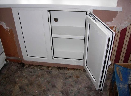 Совет: В качестве дополнительного «наворота» можно подвести освещение внутрь. Опять-таки учитывая особенности данной ниши, лучше использовать освещение с питанием от низкого напряжения (12В, 24В) с использованием понижающих преобразователей. Делаем из хрущевского холодильника полезный шкафчик Вполне приемлемым вариантом будет использование ниши хрущевского холодильника в качестве дополнительного кухонного шкафчика.
