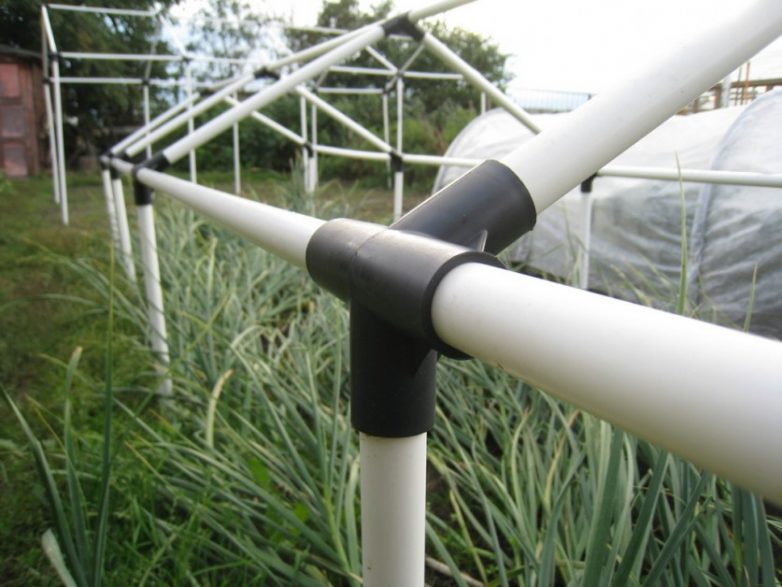Парники, теплицы и легкие каркасы на грядках для укрытия растений, собранные из полипропиленовых труб и соединительных элементов — весьма бюджетный вариант, совмещающий дешевизну и простоту сборки. При необходимости, так же легко демонтируются.