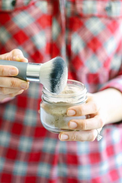 Также можно наносить сухой шампунь на корни волос с помощью крупной кисти для макияжа или помазка, словно припудривая их.