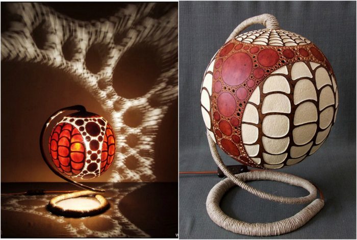 Великолепный светильник из тыквы, украшенный резными узорами.