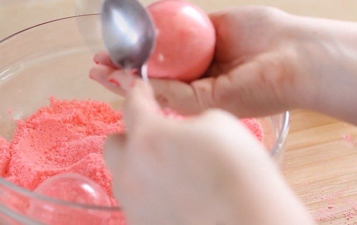 Оставьте «бомбочку» в форме на 10-15 минут, а затем аккуратно извлеките. Можно помочь себе ложкой, легко постучав по стенкам формы.