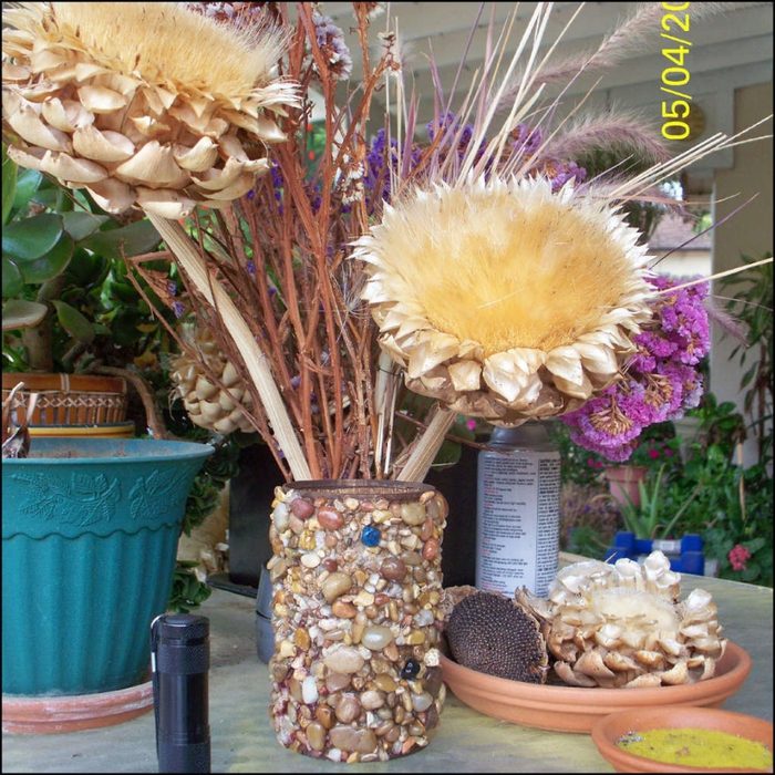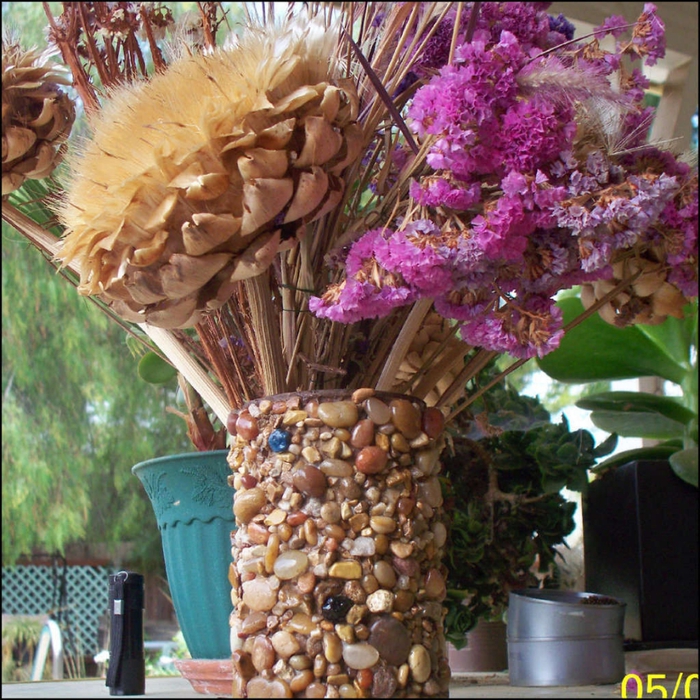 Может, кто из вас успел насобирать на море красивые камушки, морскую гальку? Подкидываю вам идею создания очень красивых цветочных ваз для украшения интерьера. А использовать мы будем ненужную тару — пластиковые и консервные банки. Посмотрите, какую красоту можно создать для осеннего декора!