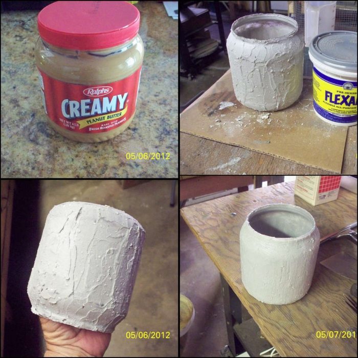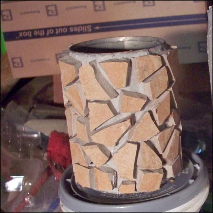 Точно так же раствор с мозаикой хорошо держится и на железной консервной банке. Если банка с неровными стенками, ее нужно сначала зашпаклевать, затем нанести раствор для мозаики.