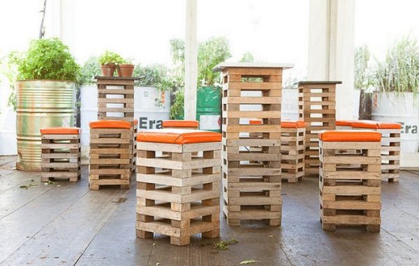 Дополнением к столу из поддонов станут, сделанные из них же стулья. Высоту этих предметов мебели можно регулировать самому.