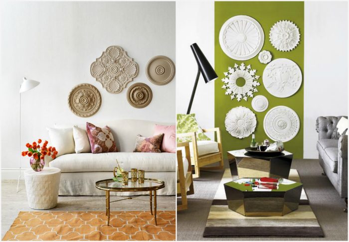 Декоративные потолочные розетки можно использовать для декора стен.