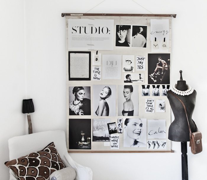 Стильное украшение, которое можно сделать из плотного картона или куска фанеры, украшенного вырезками из журналов и мотивирующими цитатами.