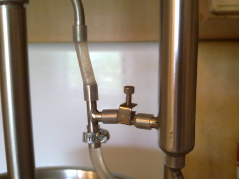 После этого зажим переставляем обратно на трубку подачи воды в восходящий холодильник и начинаем медленно, с паузами после каждого полуоборота, закрывать до тех пор, пока на выходе не появятся капли головной фракции. С этого момента начинается отбор первой фракции «голов»