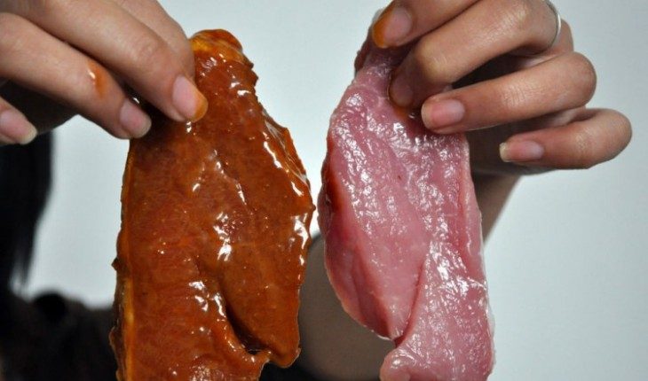 Слева – кусок свинины, замаринованный в соусе с экстрактом, а справа – натуральный поросенок.