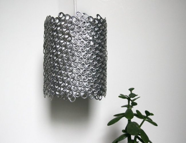 Полезные предметы можно также создавать из колечек, с помощью которых открываются банки, например, с газированной водой. Склейте их между собой, проденьте сквозь получившееся отверстие лампочку, и — вуаля! — оригинальная люстра уже у вас на потолке.