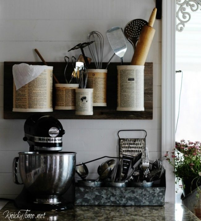 Чтобы во время приготовления кулинарных шедевров нужные вам лопатки, венчики, и ложки всегда были под рукой, храните их на полочке из жестянок. Вы можете придать банкам оригинальный дизайн, обклеив их рецептами вкусных блюд: в нужный момент будет удобно подсмотреть, не забыли ли вы какой-нибудь ингредиент.