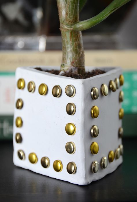 Дело осталось за малым, когда основа для горшка готова, её нужно лишь аккуратно декорировать. Для этого лучше всего использовать металлические канцелярские кнопки, особенно, если они будут золотистые или серебристые. Такой декор будет смотреться очень эффектно и стильно. На одну сторону понадобится около 16-ти кнопок, которые нужно выкладывать по форме квадрата.
