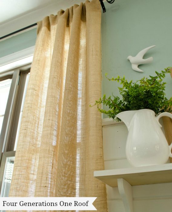 5. Замените старые шторы на самодельные, сделанные из дешевой ткани для мешков. Нотка эко-стиля в интерьере – почему бы и нет?