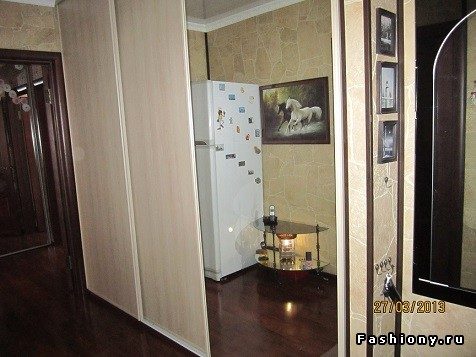 Прихожая после ремонта. Справа во всю стену трехдверный шкаф-купе с зеркальной дверью (купе у нас давно и пока менять не собираемся, очень удобно). Слева холодильник. Увы! Кухня маленькая и места там нет.