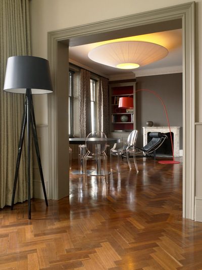 Основная претензия к ламинату — его низкая ремонтопригодность. Дескать, паркет можно перешлифовать десять раз, а ламинат только снять и выбросить. Не будем так категоричны: на фото — вдохновляющий пример от британских дизайнеров. Старый ламинат по всей квартире был зашлифован и его покрыли цветной строительной эмалью для пола в несколько слоев.