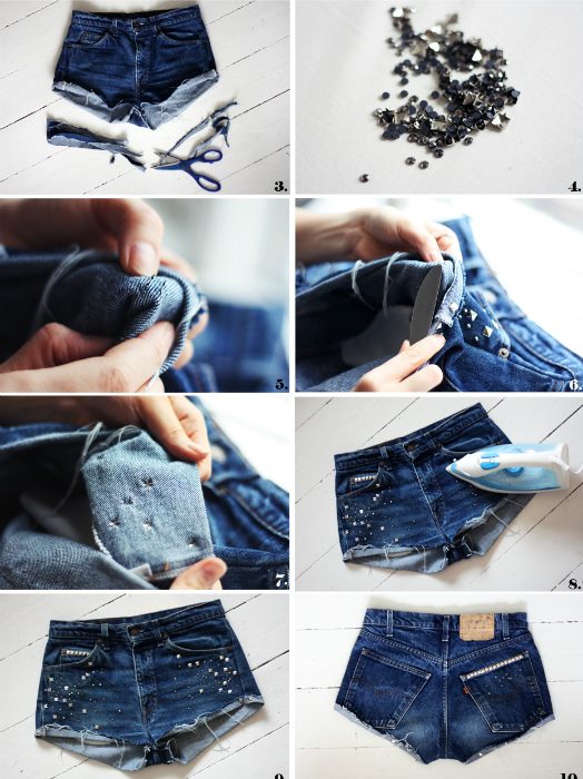 Придать старым надоевшим шортам новый вид — проще простого. Для начала их следует слегка укоротить. Для украшения можно использовать заклепки бусины или цепочки, которые без труда можно купить в магазине для рукоделия.