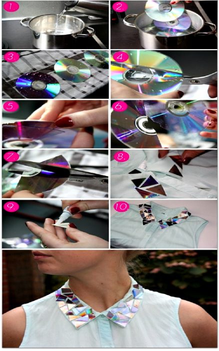 Воротник любимой блузки или рубашки можно украсить кусочками ненужных дисков. Такой простой декор преобразит любимую блузку до неузнаваемости.