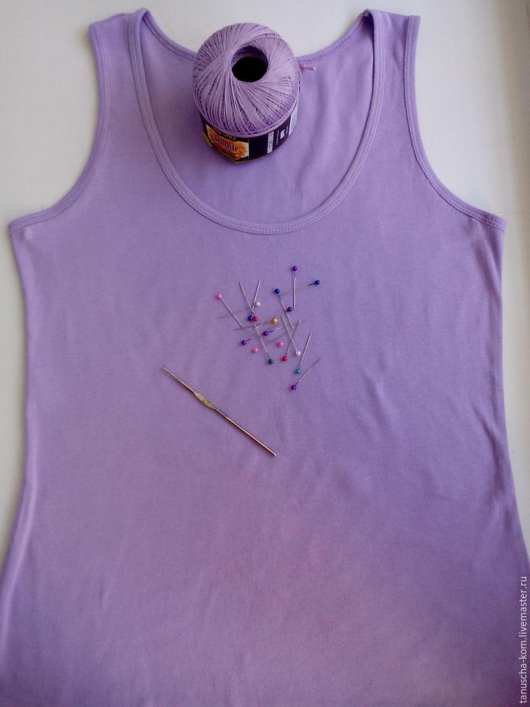 Как-то купила самую простую трикотажную майку под одну ажурную накидку, но цвет не подошёл и майка лежала у меня без дела. Так сказать — не ношенная. Не ношу я такие просто так. И вот, когда она мне глаза совсем замазолила своим бестолковым лежанием, у меня родилась идея её преобразить.