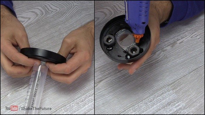 Возьмите жестяную или твёрдую пластиковую крышку и просверлите посередине отверстие, аналогичное диаметру шприца. Приклейте 3-4 гайки для устойчивости и баланса.