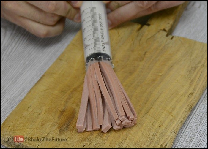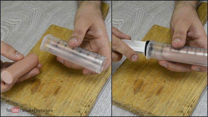 Снимите поршень, вложите сосиску в шприц, верните поршень на место и нажмите. Нарезка для пиццы за 2 секунды готова!