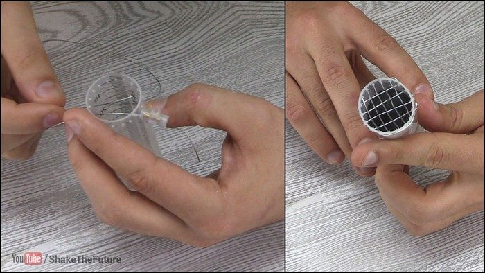 Как и в предыдущем случае, отрезаем верхушку шприца. По диаметру просверлите 18 небольших отверстий. Лучше предварительно наметить их карандашом или маркером.