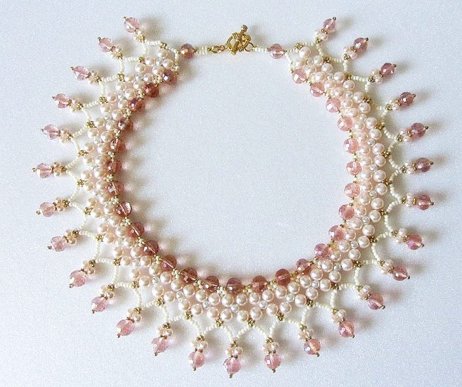 Цвет серой дымки, пыльный розовый и перламутровые жемчужины — это украшение будто принадлежало сказочной героине или состоятельной даме давно прошедших времен. Схема плетения объемная и требует внимательности, но результат впечатляет.