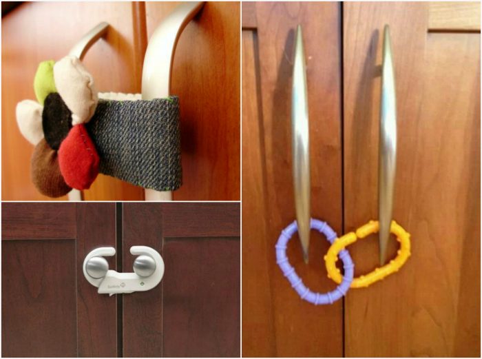 Скрепите ручки шкафов с помощью пластиковых колец для штор, резинки для волос или специального блокиратора двери, чтобы защитить содержимое шкафов от любознательного крохи, а ребенка от опасных бытовых вещей, хранящихся в этих самых шкафчиках.