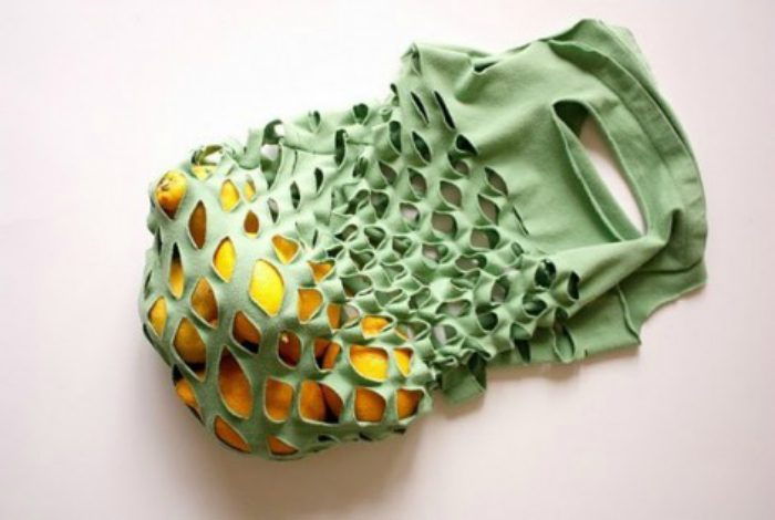 Старые футболки можно превратить в яркие и оригинальные сумки-авоськи, с которыми будет удобно ходить на рынок или в продуктовый магазин.