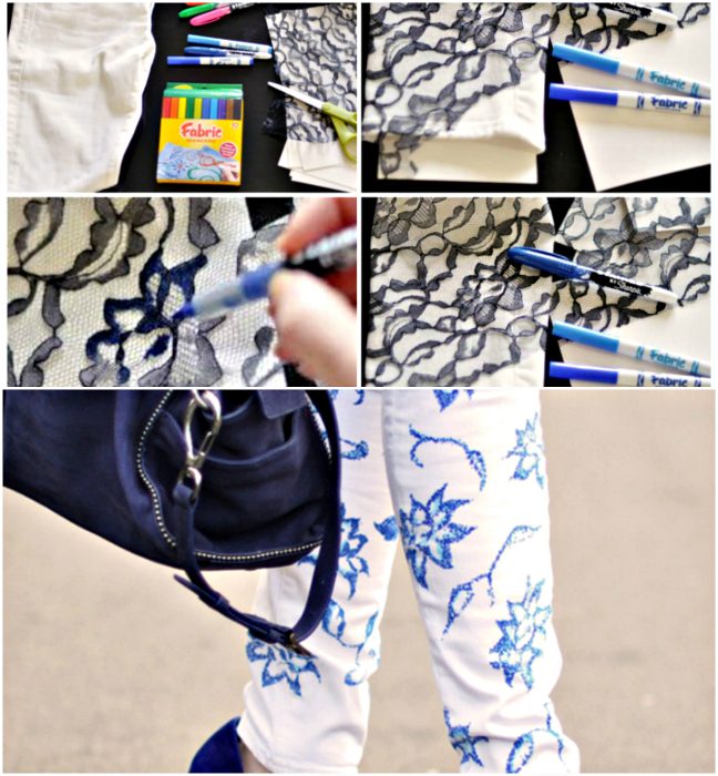Украсьте свои джинсы элегантными кружевными узорами. Для подобной трансформации понадобится небольшой кусочек гипюровой ткани и перманентный маркер. Просто приложите кружевную ткань к дениму и аккуратно обводите рисунок маркером, как через копирку.