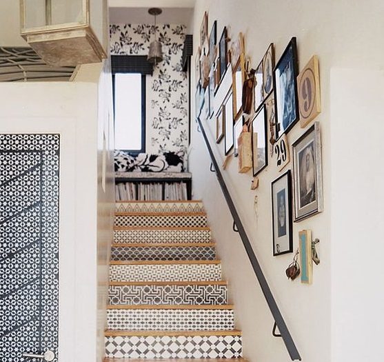 По кусочку обоев на каждую ступеньку — и вот лестница уже не чисто утилитарное сооружение, а украшение дома. Только не забудьте покрыть обои укрепляющим лаком.