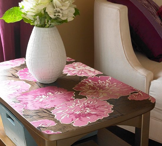 Обрезок красивых обоев прикроет побитую жизнью столешницу и вернёт журнальному столику пристойный вид. Обои нужно наклеить на дерево и затем покрыть специальным лаком для декупажа, чтобы локти гостей не протёрли дырки в бумаге. Можно, впрочем, и стеклом накрыть.