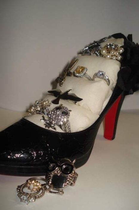 Удивительно, но при наличии фантазии не сложно превратить старые туфли в красивые и стильные органайзеры для украшений. Такая система хранения удачно впишется в интерьер женской спальни.