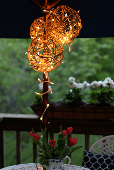 Гирлянда из маленьких лампочек станет практичным и стильным украшением беседки или летнего патио. Сделать такую гирлянду можно из обычных лампочек или из теннисных шариков, надетых на лампочки елочной гирлянды.