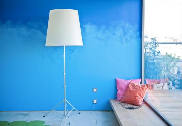 Если вы не хотите особо утруждаться с переходами, а просто желаете получить необычную и яркую акцентную стену, то просто покрасьте ее двумя смежными оттенками краски, а посередине небрежно пройдитесь кистью, перемешивая цвета. Можно также использовать валик, чтобы эффект получился более мягким. Сам процесс очень прост и совершенно не потребует от вас какой-либо аккуратности.