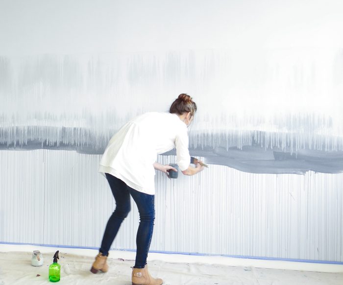 Суть покраски проста: каждую проведенную на стене полоску краски следует обильно смочить водой из спрея, чтобы появились «подтеки». И так раз за разом, пока вам не надоест или пока стена не будет готова. Чем больше подтеков, тем лучше!