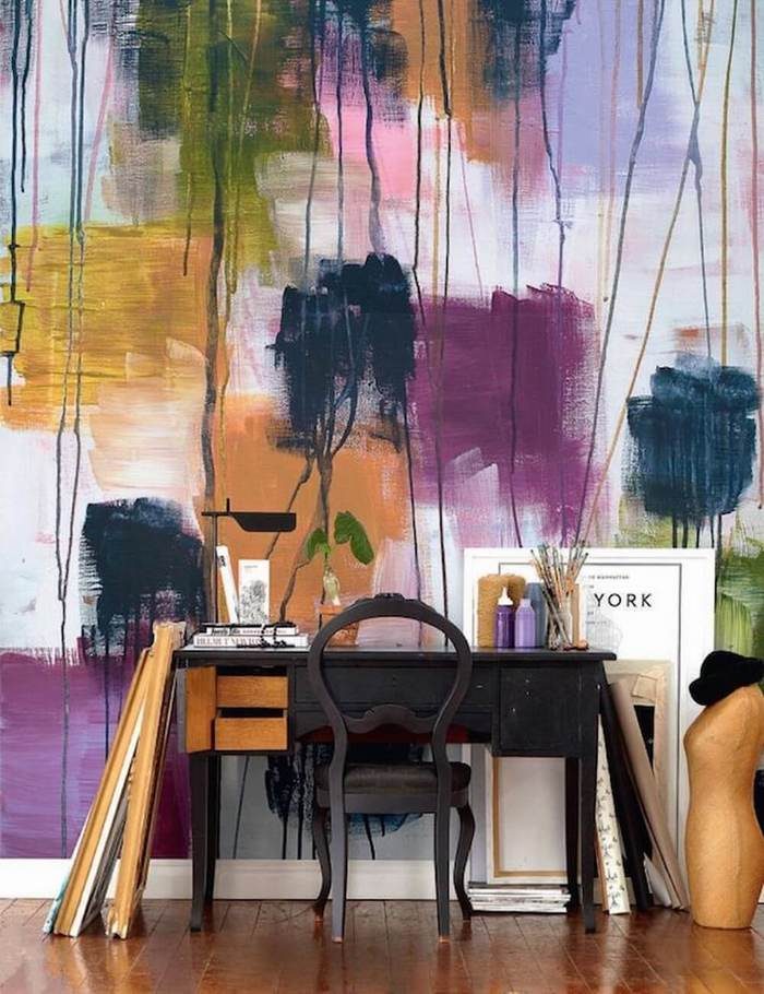 Если акварельная тема вам по душе именно благодаря тому, что можно получить эффект подтеков, как будто вас залили соседи сверху, то нет ничего проще! Вам нужно лишь вооружиться кистью, красками на водной основе и водой. Смешивайте краски, как вам вздумается и активно взмахивайте кисточкой: чем больше будет амплитуда, тем выразительнее получатся ваши подтеки. Перед работой рекомендую тщательно укрыть пол пленкой.